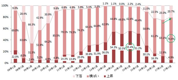 不動産価格は2016年1月から1年半にわたって横ばいの見通しが支配的で、「上昇」は28%、「下落」は4.9%。上昇が3割前後をキープする一方、下落するとの見通しは少数にとどまっている。