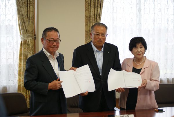 ▲(写真左から)富山県生協松浦松浦均理事長、金森勝雄舟橋村長、coopとやま稲垣よし子理事長