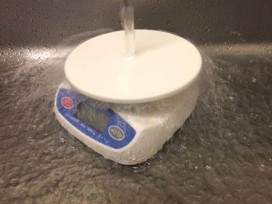 新商品は、水深1メートルの深さに30分間浸漬するテストに合格し、本体背面側に持ち運び用の取っ手付き。ワンタッチ風袋引き機能で容器の重さを差し引き、量りたい材料のみの重さを量ることができる。