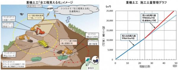 この仕組みを用い、フジタは連携作業がスムーズになり、建設機械の手待ち時間が大幅に短縮され稼働率が向上するという効果が確認。現場全体の建設機械とダンプトラックの計画的で効率的な配置が可能になった。