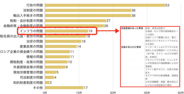 インフラの問題では「輸送・物流インフラの改善」「都市部での慢性的な交通渋滞」などが指摘される一方、インフラ整備の進展を評価する声もあった。鉄道・港湾出荷能力、北海道-ロシア間の貨物輸送ルートの強化、電力・通信などビジネスインフラの強化を求める声が寄せられた。