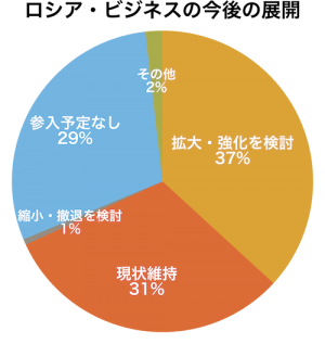 調査・データ 経団連が6日発表したロシアのビジネス環境に関するアンケート結果によると、ロシア・ビジネスの拡大・強化を検討している企業は回答企業161社のうち60社(36.8%)となった。