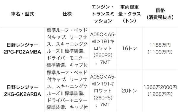 東京地区の希望小売価格は16トンクラスが1188万円(消費税込)、20トンクラスが1366万2000円とし、日野レンジャーシリーズ全体で年間1万7000台の販売を目指す。