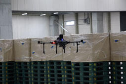 ▲パレットを貨物に見立てたテストコースで、床面と貨物との位置関係をレーザーで検知して半自律飛行するドローン