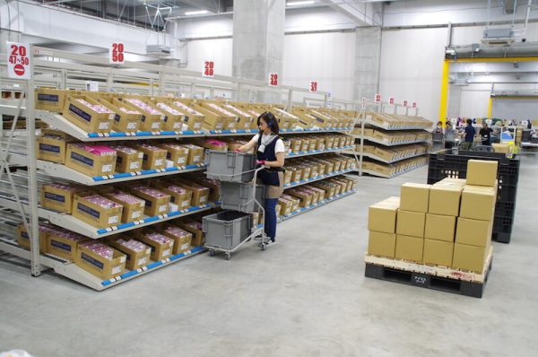 新拠点は、7月1日に稼働を開始した東京流通センター(TRC)新B棟に開設したもので、それまで使用していたTRCのA棟から8月18日に拡張移転。自動製函機「E-Cube」、フェッチ社の自律型搬送ロボット、音声ピッキングといった最新技術を導入し、自社開発の3ボックスカートなどを効果的に活用。1720坪のスペースながら、移転前の1.5倍の出荷能力を実現した。