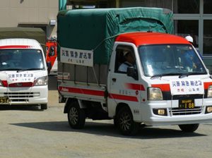 当日は、組合員4人、赤帽車3台が参加し、白バイを先導に赤帽山梨県、山梨県トラック協会、LPガス協会、市道路パトロールカー、南甲府警察署パトカーが玉諸小学校に物資を搬送する緊急路確保・物資輸送訓練が行われた。