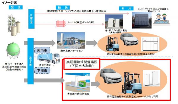 トクヤマが山口県、下関市、周南市、東ソーと共同で、苛性ソーダ工場で発生する未利用副生水素を回収、液化・圧縮などを経て輸送し、周南市や下関市といった周辺地域で、定置用燃料電池や燃料電池自動車などで利用する。