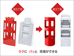 「ラクにパッと売場がつくれる紙製汎用型フロアディスプレイ」という製品の特徴を商品名に表したラクッパディスプレイは、高いディスプレイ機能と充分な強度を両立した販促ディスプレイで、ワンアクションで誰でも簡単に組み立て、折りたたむことができる。汎用性の高さから、多様な商品を陳列することができるため、その日に薦めたい商品を素早く並べて販売機会を確保するといった利用が可能。
