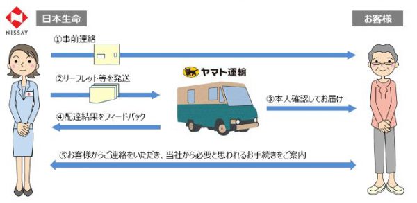 同社は営業職員が高齢の契約者を訪問し、対面して入院などの支払事由の発生有無の確認や、契約内容の説明を行っているが、これまでのサービスに加えて新たにヤマト運輸の本人確認サービスを活用し、自社商品やサービス内容を記載したリーフレットを届ける。