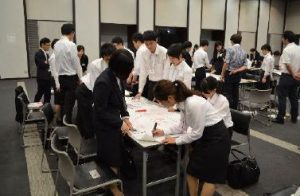 講演後はインターンシップ4日間で習得した知識を持ち寄り、参加学生間で物流業をテーマとした企画提案型のグループワークが行われた。午後の座談会では、参加企業若手社員との交流の場として、物流いいとこみつけ隊を含む参加企業のスタッフ44人が、1-2人で学生5人程度を担当する座談会をローテーションで6回行い、一人ひとりの学生の質問に応答、交流を深めて5日間の全日程を終了した。