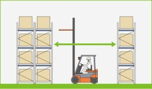 ラックストッカーは、フォーク部分が左右に180度回転することにより、車両の向きを変えずに前方・左右3方向の荷役作業が可能なフォークリフト。ラック(棚)間の通路幅を車両幅とほぼ同等に抑えることができるため、スペースを有効に活用できる。