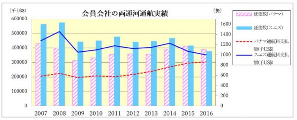 パナマ運河全体では、同運河庁発表の16年度実績によると前年度に比べて通航船舶は減少し(前年度比5.5%減)1万3114隻、通航船舶トン数PC/UMSも前年度比3%減となった。また、通航収入は前年度比3.1%減の19億3300万ドルとなった。