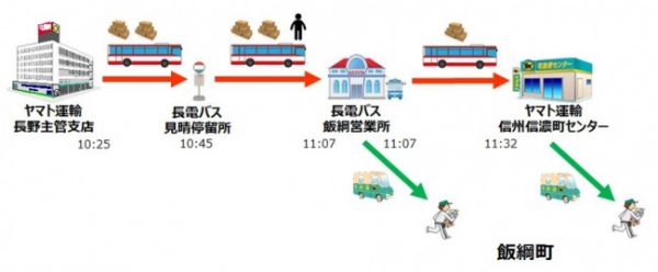 長電バスは、長野市を中心にバス路線網を展開しており、飯綱町、ヤマト運輸の3者が連携して路線バスで宅急便を輸送する。