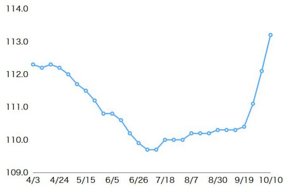 | 地域 | 10月10日(単位:円) | 10月2日(単位:円) | 上昇率 |