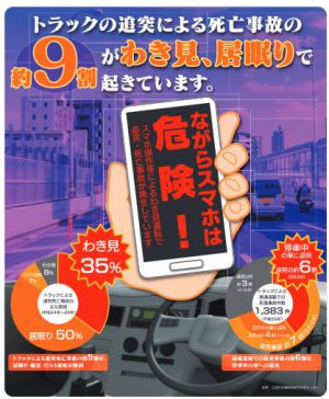 ロジスティクス運転中に携帯電話・スマートフォンを使用した追突事故が発生していることを受け、全日本トラック協会は11月16日から来年1月10日に展開する「正しい運転・明るい輸送運動」の重点項目に、携帯・スマートフォンの使用禁止の徹底を追加する。