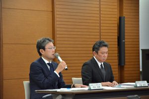 ▲模擬記者会見の様子(写真左)尾本直俊常務執行役員(右)伊藤浩也自動車船部運航・輸送品質グループグループリーダー