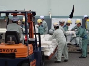 ▲防油堤亀裂箇所への土のう構築の様子