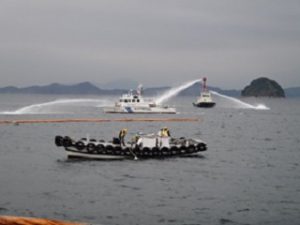 海上防災訓練は、今治海上保安部、菊間地区共同防災組織などの参加を得て、流出油の拡散予測、航行制限区域の設定、流出油の防除・回収・拡散処理の訓練を行った。