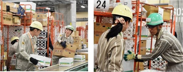 新人作業担当スタッフへ適切に指示を出しながら荷物を安全にベルトコンベアへ運ぶ「流し作業部門」と、新人作業担当スタッフが担当している仕分けエリアに応援に入り、荷物をロールボックスパレットへすばやく積み付ける「積み付け部門」に分かれて技能を競った。