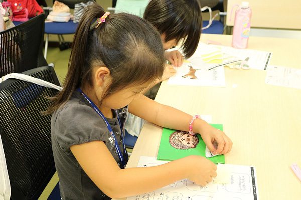当日は、本店に勤務する社員の小学生14人が訪問し、会社概要についての説明を受け、絵本に翻訳シールを貼るボランティア活動やオフィス見学などを行った。