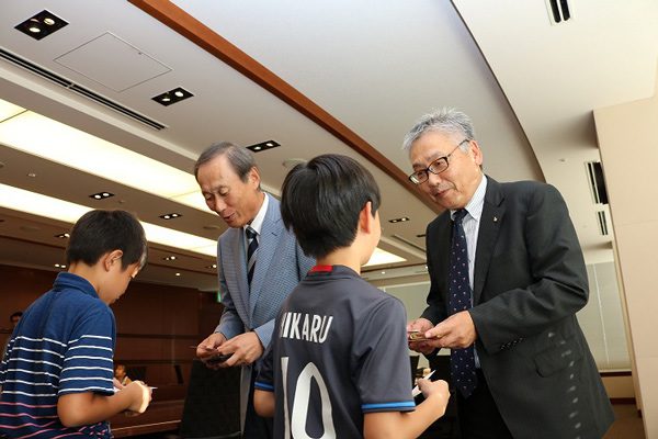 ▲工藤泰三会長、吉田芳之常務経営委員と名刺を交換する様子