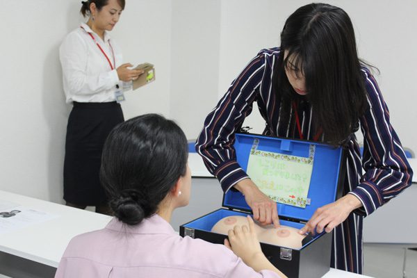 同社従業員の女性比率は40%を超えていることから、女性従業員のワークライフマネジメント推進が重要だとして、社内啓発を目的にセミナーを開催した。40人の従業員が参加し、ピンクリボン代表理事の新井氏が乳がんに関する基礎知識や、自己検診用グローブ「ブレストケアグラブ」の使用方法などを説明した。