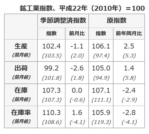 調査・データ経済産業省が10月31日に発表した9月の鉱工業指数(速報)は、前年に比べ生産、出荷は低下、在庫は横ばい、在庫率は上昇だった。基調判断は「生産は持ち直しの動き」で11か月連続で据え置いた。