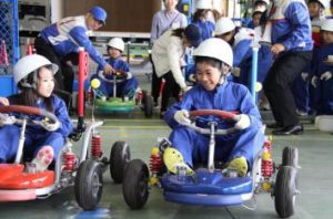 当日は19人の子どもたちが親と同じ青い作業着を着て参加し、製造工場の見学や佐川急便の配送トラックの乗車体験、同社社が開発・設計・製作したオリジナル子供用カートの運転体験、荷台の側面が開くウイング車の開閉体験などを行った。