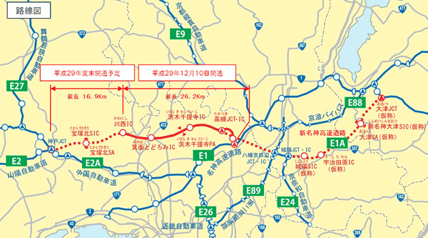 拠点・施設西日本高速道路(NEXCO西日本)は7日、新名神高速道路の高槻JCT・ICと川西ICを結ぶ26.2キロの区間が12月10日に開通すると発表した。
