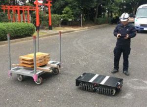 クローラーTOは狭いスペースでもスマートフォン操作で重量物を積載した台車の下に潜り込み、リフター機能を使って持ち上げ、搬送。トピー工業など3社と建設機械レンタル会社が共同で試行と改良を重ね、2018年2月を目標にレンタル、販売を開始する。