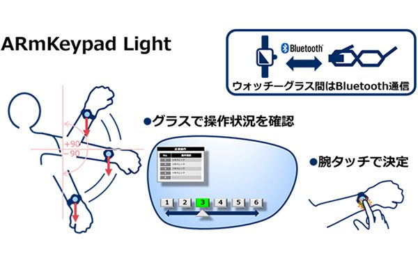 今回用いたアームキーパッドは、腕に表示される選択画面をタッチ(振動)することで入力可能とするこれまでのアームキーパッドに対し、スマートグラス上に表示される選択画面を腕の傾きと腕へのタッチにより入力可能にすることで、対象物から視線を外さないアイズフリーでの操作機能を追加した。