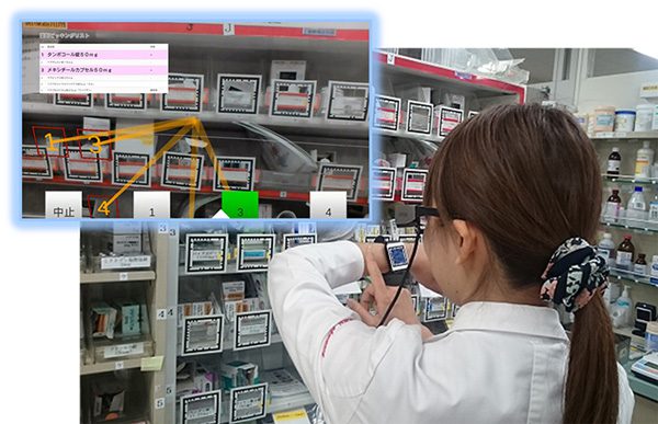 病院の薬剤部での実証実験では、グラスカメラで処方箋バーコードを読み込み、薬剤ピッキングリストをグラスへ表示、薬剤棚をみるとどの棚からどこにある薬をピッキングすればいいのかがARでガイド表示されるという薬剤ピッキングの作業ミスを防止する実証実験を実施。