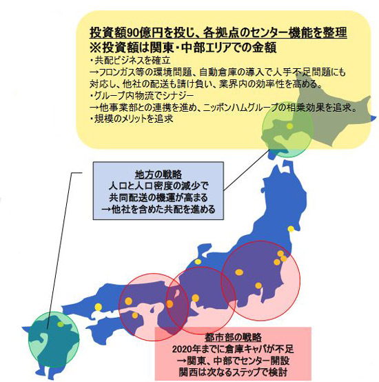 拠点ごとの物流センター機能を整理するため、まずは関東・中部エリアで新拠点を開設するために90億円を投資し、共配ビジネスの確立を目指す。併せてグループ内の物流で相乗効果を追求、ほかの事業部との連携を進める。