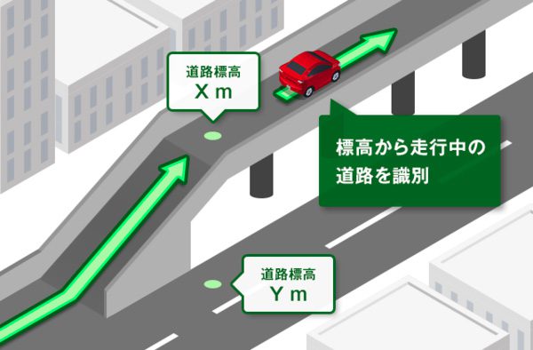 今回バージョンを更新したことで、独自開発のアルゴリズムによる各種センサーを用いた自律航法技術によって道路標高を推定し、全国の道路標高データを含む地図情報とマッチングさせる3Dマップマッチング機能を活用することで複数道路が並行する場所でも、現在走行中の道路を正確に判定し、最適な自車位置表示・ナビゲーションを行うことができるようになった。