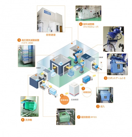 密閉建屋内に設置したアームロボットが全自動で容器の中から廃棄物を取り出し、高圧蒸気滅菌装置、洗浄機を経て再利用。容器の蓋が閉まった状態で投入口にセットするだけで滅菌工程まで全自動で運転される方式で、作業員の安全性も担保されているという。