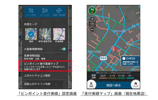ほかのドライバーが通行した実績を可視化できる機能を提供することで、経験の浅いトラックドライバーや初めての場所へ行くトラックドライバーがより簡単に通行可能な道路を確認することが可能になる。今後、iOS向けトラックカーナビにも、段階的に対応する。
