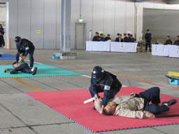 ソフト警戒棒や刺又などを使用した実技訓練のほか、合気道・空手道を取り入れた護身術、救急蘇生法の訓練など、警備員として必要な知識・技能の向上に向けた訓練を行った。