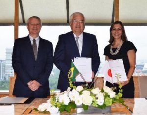 ▲(写真左から)Vale International社Mr.Lu iz Meriz, Directo r、NSユナイテッド海運の小畠徹社長、Vale International社Ms.Renata Costa Zingre,Director