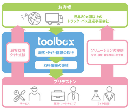 ツールボックスは、ブリヂストンのスタッフが運送事業者を訪問した際に取得する基本情報、装着タイヤ情報、タイヤ点検結果、テストタイヤ等の情報を管理するツールで、世界80か国以上で展開している。