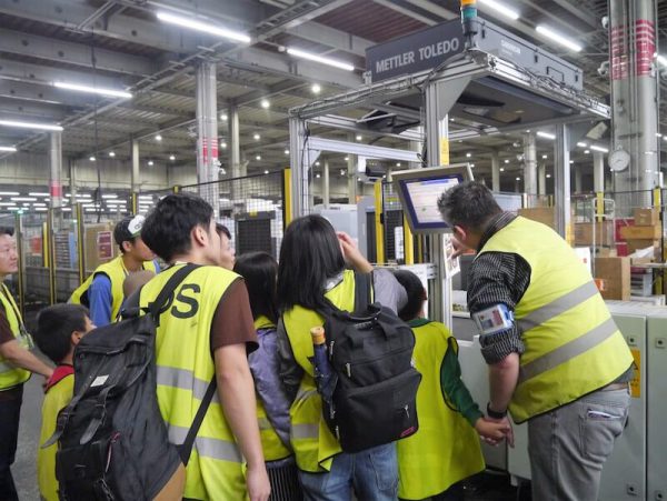 ▲関西国際空港内のUPSハブ施設でUPS社員にDWSシステムの説明を受ける「こどもの里」の子供達