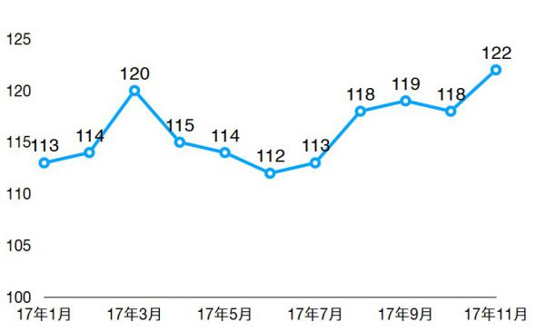 ロジスティクス全日本トラック協会(全ト協)と日本貨物運送協同組合連合会(日貨協連)が5日に公表した求荷求車ネットワーク「WebKIT」(ウェブキット)の11月の成約運賃指数は、前月比4ポイント増、前年同月比7ポイント増の122となった。消費税増税前の2014年3月の126に次いで2番目に高い運賃指数となった。