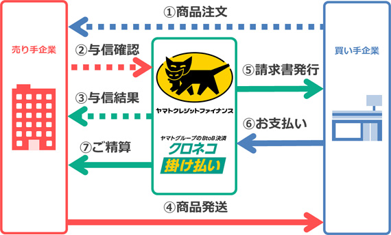クロネコ掛け払いは、買い手企業への与信調査から、請求書発行、集金などの業務を売り手企業に代わって行うサービスで、買い手企業の支払いや売り手企業の売掛金未回収リスクをヤマトクレジットファイナンスが保証する。