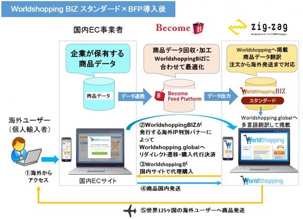 EC越境EC支援事業を手がけるジグザグ(東京都渋谷区)は13日、同社の支援ソリューション「ワールドショッピングビズスタンダード」で、ビカム(東京都港区)が提供するデータフィード最適化サービス「ビカムフィードプラットフォーム」(BFP)との商品データ連携に対応したと発表した。