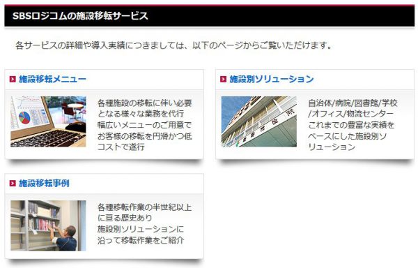 ロジスティクスSBSホールディングス傘下のSBSロジコムは13日、 自治体、病院、図書館、学校、オフィス、物流センターなどの施設移転に関するサービス内容を整理し、自社ウェブサイト上の「施設移転サービスページ」を全面リニューアルしたと発表した。