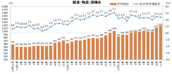 調査・データリクルートジョブズ(東京都中央区)は14日、調査研究機関「ジョブズリサーチセンター」がまとめた11月のアルバイト・パート募集時平均時給調査の結果を発表した。「製造・物流・清掃系」の平均時給は三大都市圏で1018円となり、前年同月比で24円(2.4%)増加した。