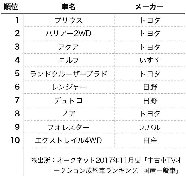 ランキングは、全国1万4000店の中古車販売店がTVオートオークションを利用し、成約した結果を国産一般車・軽自動車・輸入車に分けて集計したもので、10月の国産一般車ランキングにはトラックは10位以内に入っていなかった。
