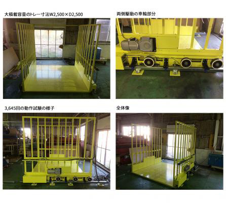 この製品は両側駆動にすることにより、積載容量を大きくし積載重量を上げることができる。積載重量は2000キロで、トレー寸法は間口2,500センチ×奥行2500センチ×高さ2500センチと、従来型と比べて積載重量2倍・トレー面積2.6倍となり、搬送効率を2倍以上に高めることができる。積載荷重2200キロで計3645回の動作試験をクリアしている。
