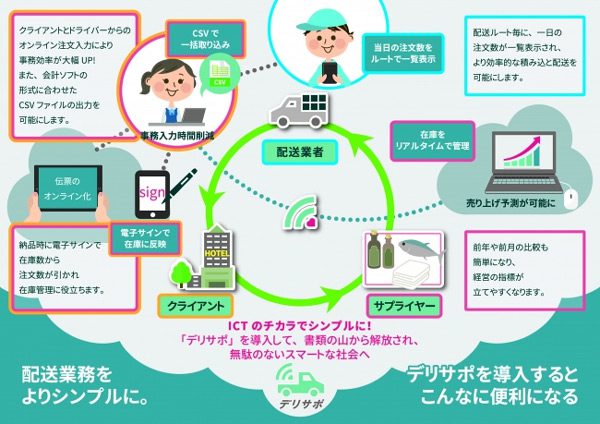 デリサポの開発により、納品時に電子サインでリアルタイムの納品管理ができるようになるため、ペーパレス化を実現するとともに、オンライン処理により直接納品確認が可能になる。今後サプライヤー全体の伝票や金融処理の電子化促進と併せて、配送ルートの確認も整理ができるため、運送業務自体の効率化につなげる。また、サプライヤの在庫管理もこのクラウドシステム上で行うことができるよう開発を進める。
