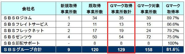 ロジスティクスSBSホールディングスは9日、全日本トラック協会(全ト協)が認定する貨物自動車運送事業安全性評価事業(Gマーク制度)で安全性優良事業所として新たに9事業所が認定を受けたと発表した。これにより同社グループ全体でのGマーク認定事業所数は129事業所、取得率は81.6%になった。