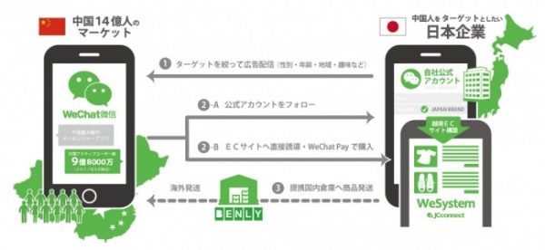今回JCCは、海外配送・転送サービスを提供するBENLY(ベンリー、東京都中央区)と業務提携することにより、ウィーチャット公式広告サービスによる集客から販売・決済、海外配送までをワンストップでサービス提供することが可能になった。